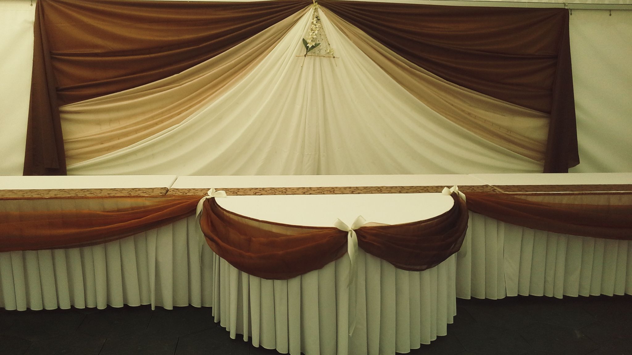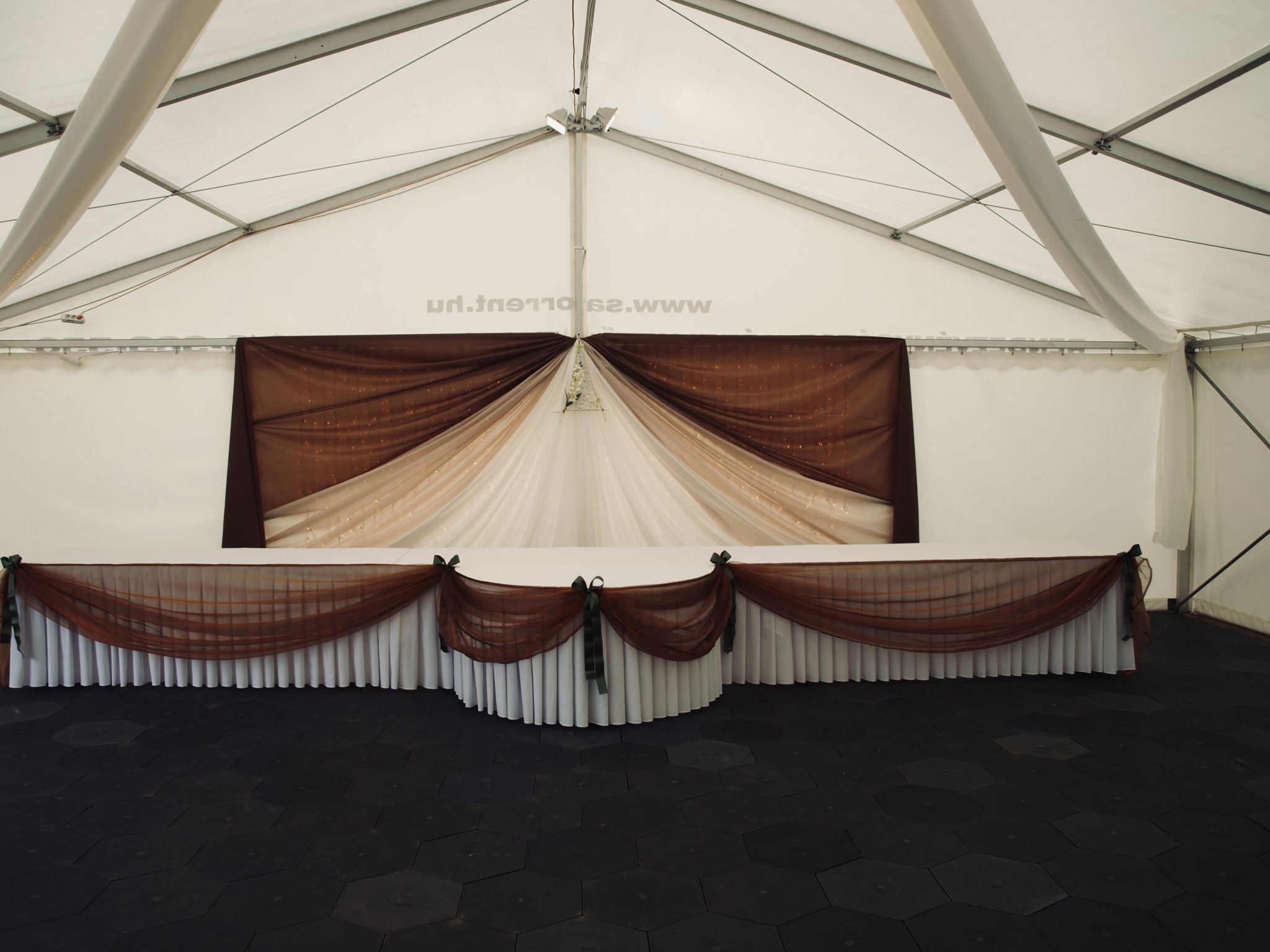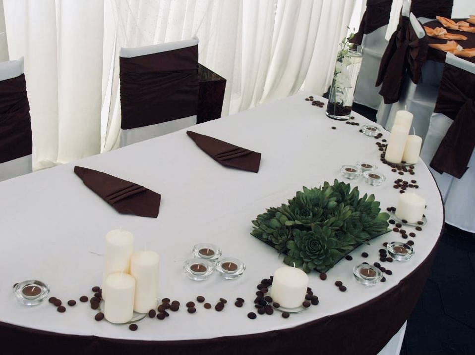 150 cm szélességű, állítható lábmagasságú félkör asztalaink a főasztalok elé helyezve különleges eleganciát biztosítanak. Az asztalszoknya és a díszítő elemek még egyedibbé tehetik.