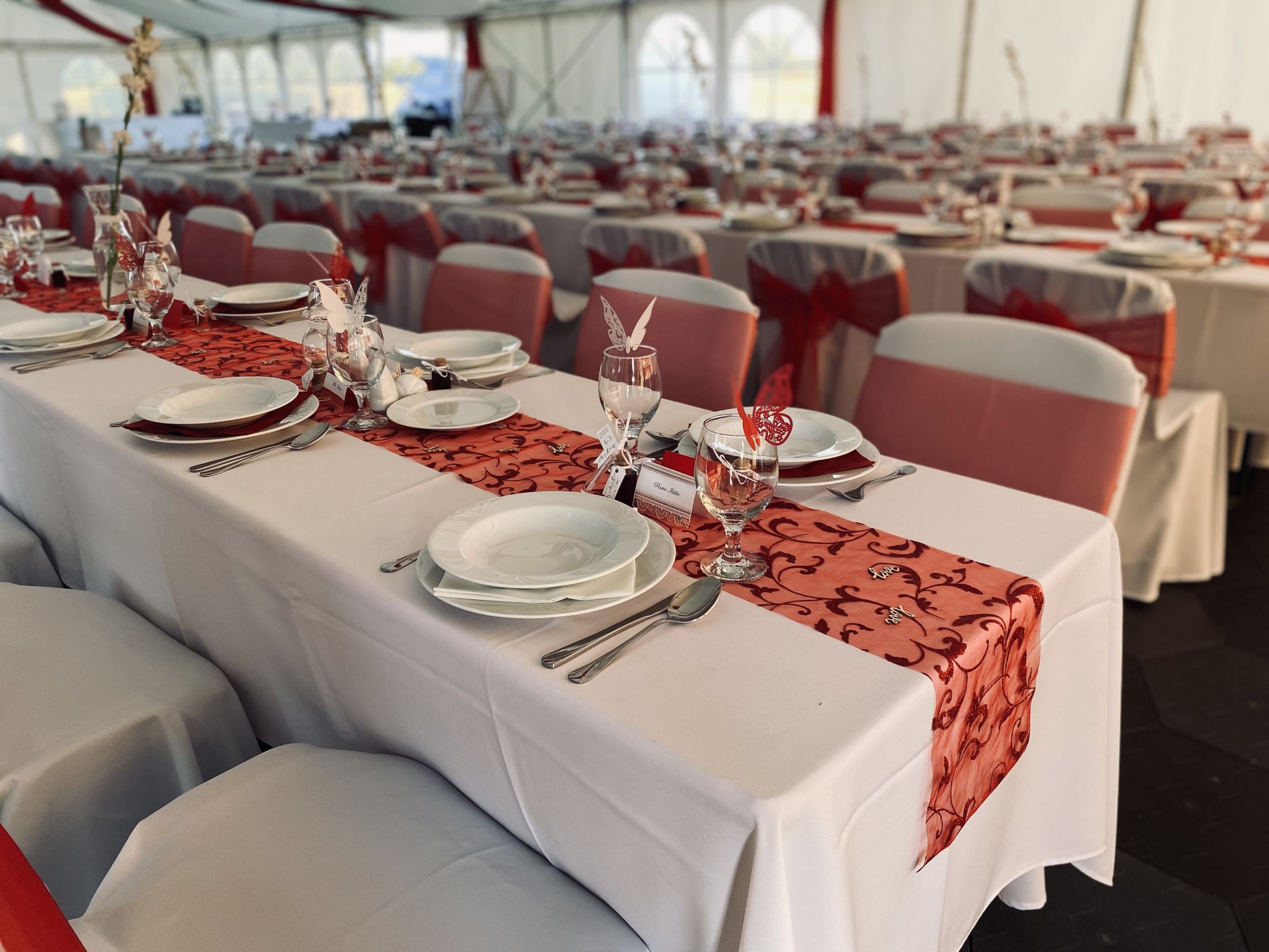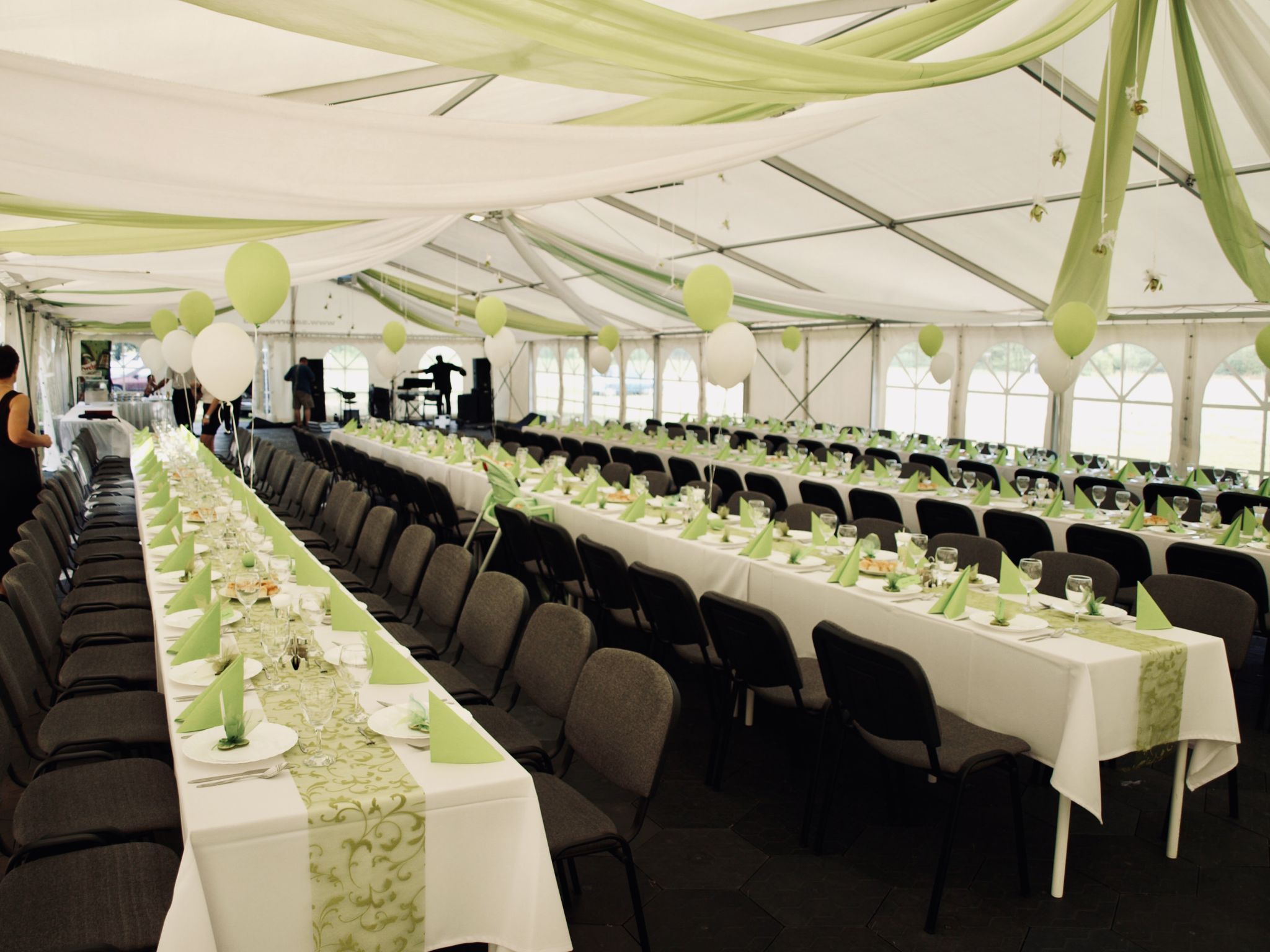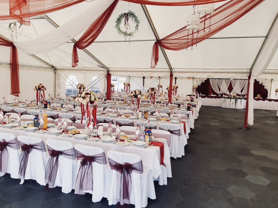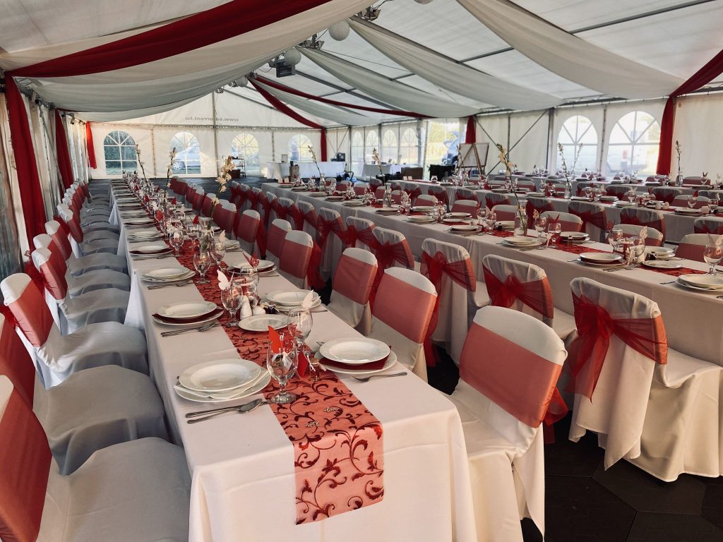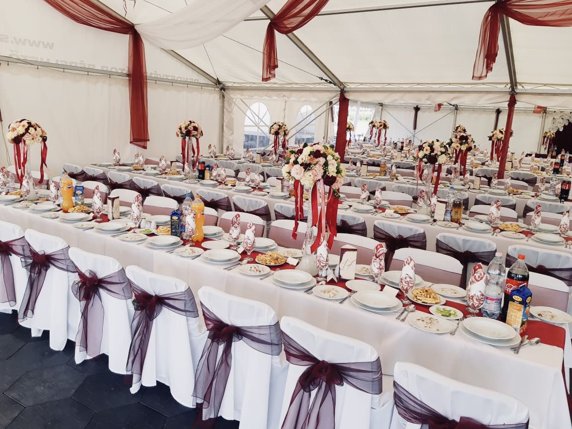70 cm x 220 cm táblaasztalok összecsukható lábakkal. Székkel berendezve 6-7 fő, paddal pedig 8 fő leültetésére alkalmasak. Igény szerint terítőket, asztalszoknyákat is tudunk hozzá biztosítani