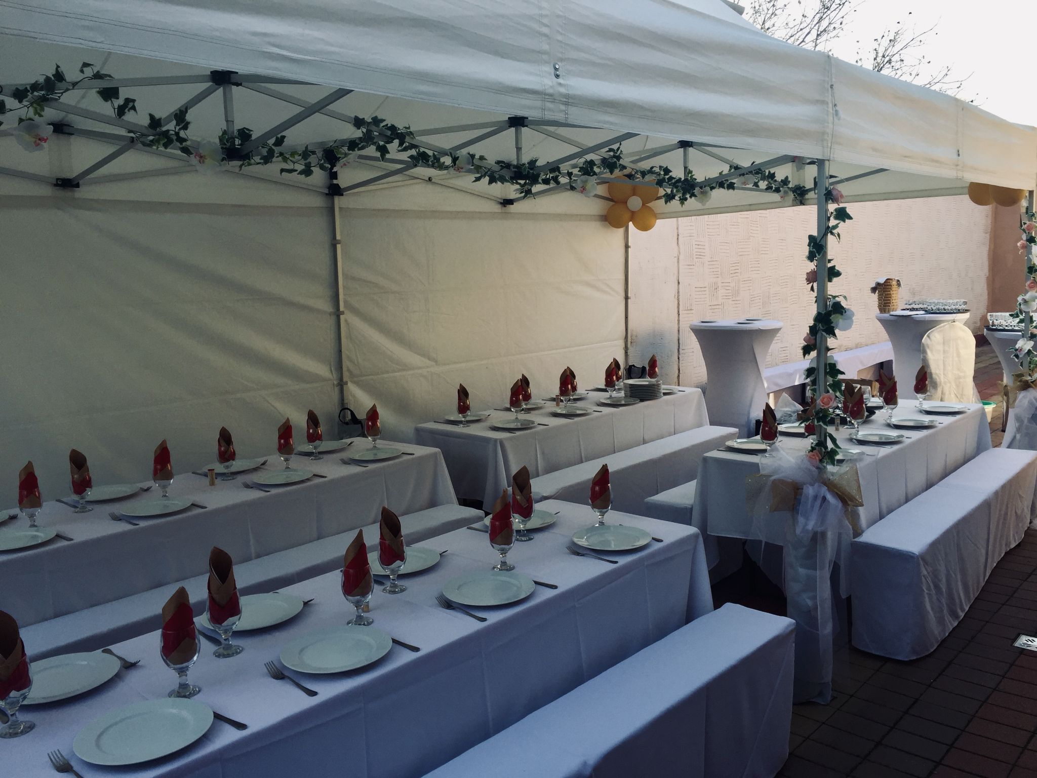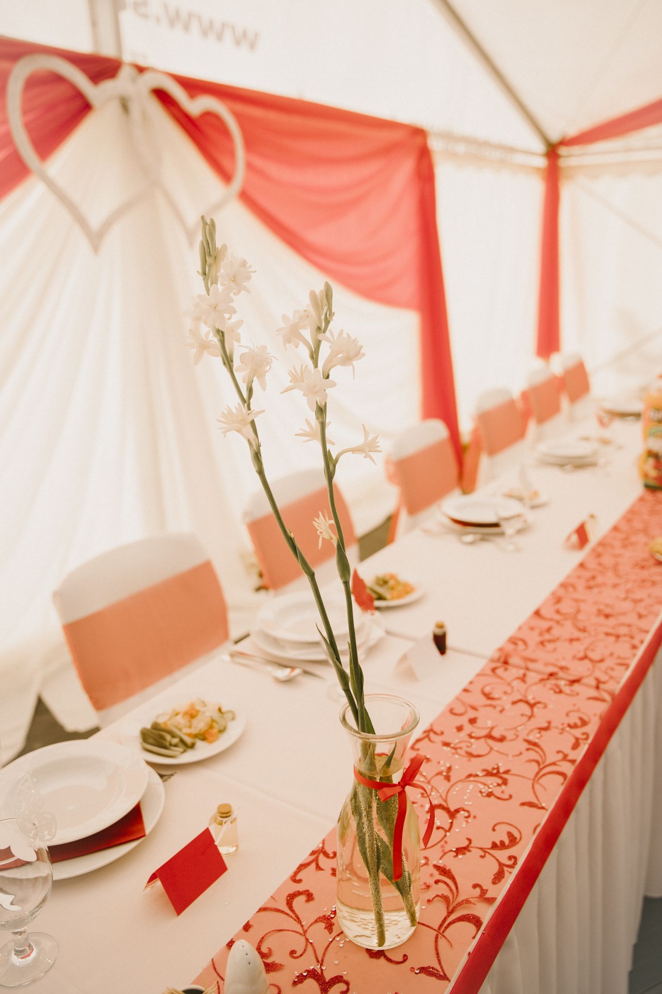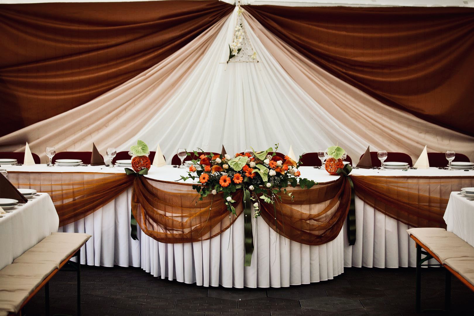 A fehér rabroszokra színes középfutó terítőket ajánlunk, amelyek a sátor vagy a terem dekorációjával harmonizáló színben választhatók.